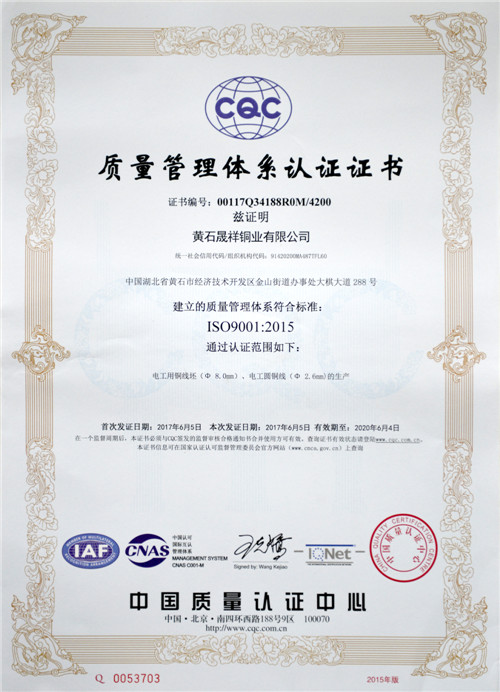 公司已通過(guò)ISO9001:2015質(zhì)量管理體系認(rèn)證。公司產(chǎn)品主要包括Φ8mm低氧光亮銅桿和Φ2.6mm電工圓銅線(xiàn),產(chǎn)品均已順利通過(guò)國(guó)家電線(xiàn)電纜質(zhì)量監(jiān)督檢驗(yàn)中心檢測(cè),多項(xiàng)理化指標(biāo)均達(dá)到GB/T 3952-2008一級(jí)品標(biāo)準(zhǔn)。